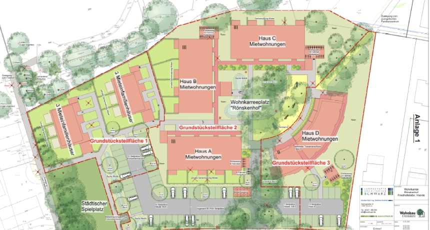 Der Bebauungsplan wurde bereits von der Stadtverwaltung vorgestellt und in der Bürgerversammlung vor einigen Wochen durchweg positiv aufgenommen – bis hin zu der Frage, wo man sich für Wohnungen bewerben könne. Neben Wohnraum für große Familien sind seniorengerechte Wohnungen vorgesehen, die zum Teil für ältere Bewohner des Viertels nördlich der Bahnhofstraße interessant sind. Viele möchten sich „kleiner setzen“ und die Einfamilienhäuser verkaufen oder ihren Kindern überlassen. < Kurze Beschreibung der geplanten Maßnahme > Ein großer Teil der Bäume bleibt erhalten. Auch der kleine Weg quer durch den Rönskenhof bis zum neuen Gemeindezentrum und zum evangelischen Kindergarten soll weiterhin öffentlich nutzbar sein. Für Fahrzeuge wird auf dem Grundstück ein Parkplatz eingerichtet. Die Gebäude passen sich mit der Firsthöhe der Umgebung an. Gute und preisgünstige Wohnungen lassen sich auf diese Weise auch in zwei- bis dreigeschossigen Häusern realisieren.